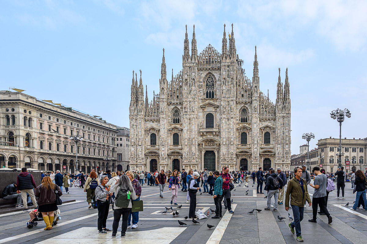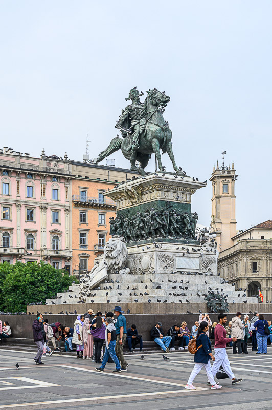 Der Dom steht prominent im Zentrum der historischen Altstadt – so wie es sich gehört. Vorgelagert ist ein riesiger Platz – die Piazza del Duomo – voller Leute (meist Touristen) und Tauben (Einheimische). Direkt an der Piazza liegt auch der bekannte Einkaufstempel Galleria Vittorio Emanuele II mit seinem vorgelagerten Triumphbogen. In der Mitte thront hoch zu Ross Vittorio Emanuele II., der König von Italien von 1861 bis 1878. Er hat das geteilte Italien vereint und ist hochverehrt.