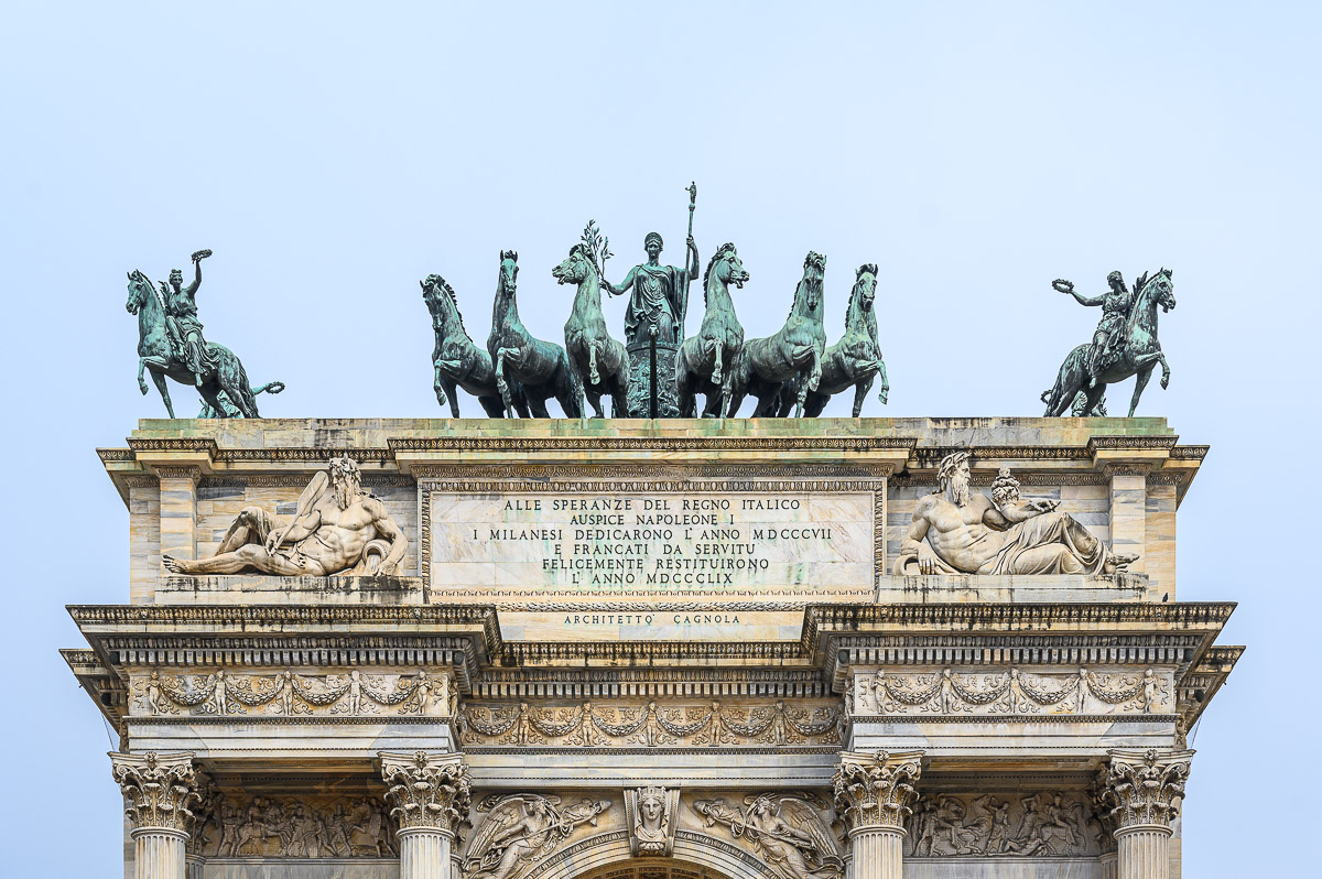 Das von Luigi Cagnola geplante 25 m hohe Bauwerk zur monumentalen Ausgestaltung der Porta Sempione war bereits zu etwa zwei Dritteln fertiggestellt, als das italienische Königreich Napoleons fiel und die Arbeiten eingestellt wurden. Sie wurden erst 1826 fortgesetzt, unter Kaiser Franz I., und das Werk dem Frieden von 1815 gewidmet.