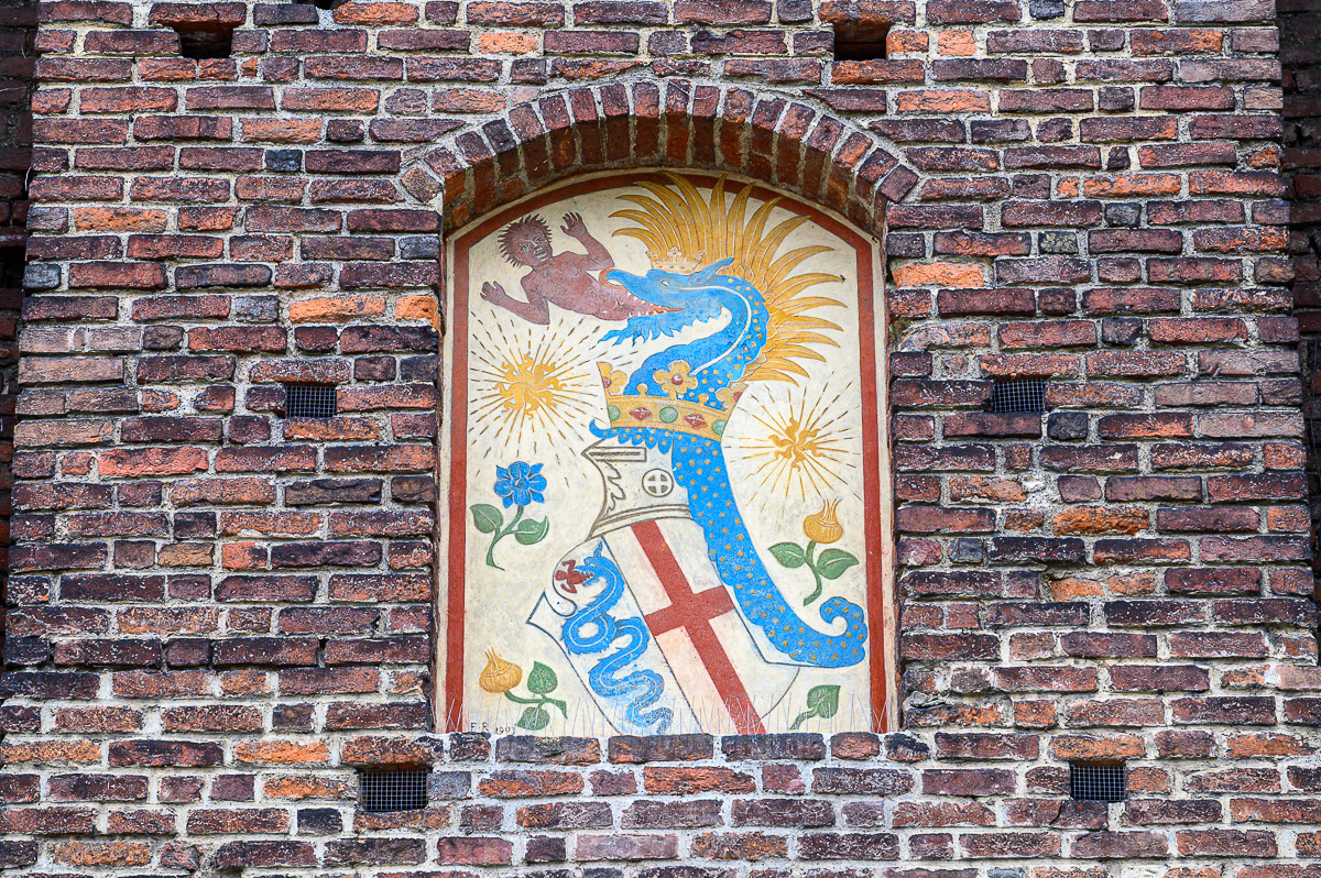 Das Wappen der Familie Visconti ist omnipräsent in dieser Anlage. Es stellt einen Schlangendrachen dar, welcher einen Menschen verschlingt (Biscione). Die Familie Visconti ist eine der grossen Familien Italiens, welche lange Zeit Mailand und die Lombardei beherrschten. Sie beanspruchen für sich die Abstammung von Desiderius, dem letzten König der Langobarden. Heute ist der Biscione das allgemeine Symbol für Mailand und die Lombardei – und der Automarke Alfa Romeo.
