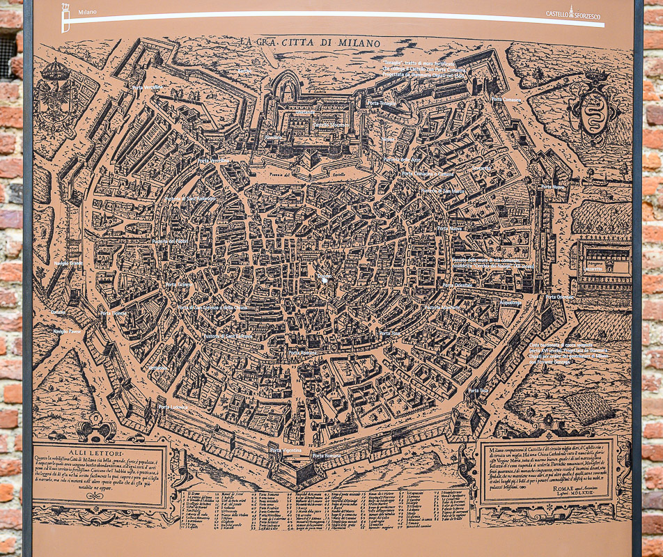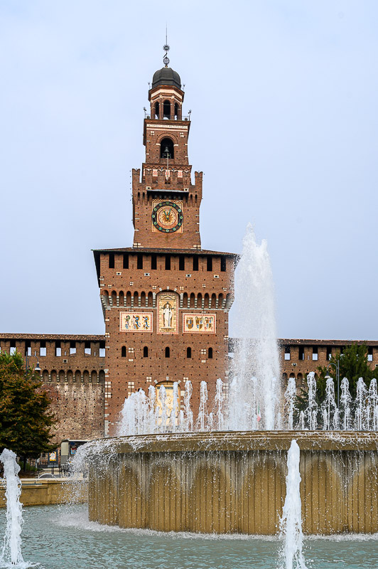 Schon kommen wir zum Ende des Parks mit der gigantischen Festung, dem Castello Sforzesco. Das Kastell war ursprünglich ein Teil der gesamten Stadtbefestigung, welche ganz Mailand mit Mauern und Wassergräben umschloss. Die Basteien (Festungsmauern) wurden ab 1800 durch Napoleon I. geschleift und teils überbaut, teils parkartig (Parco Sempione) umgestaltet. Heute befinden sich mehrere Museen und Schulen in den Räumlichkeiten.