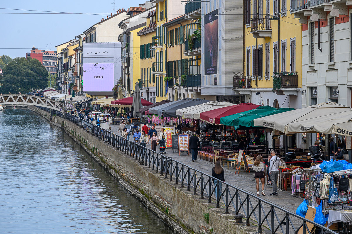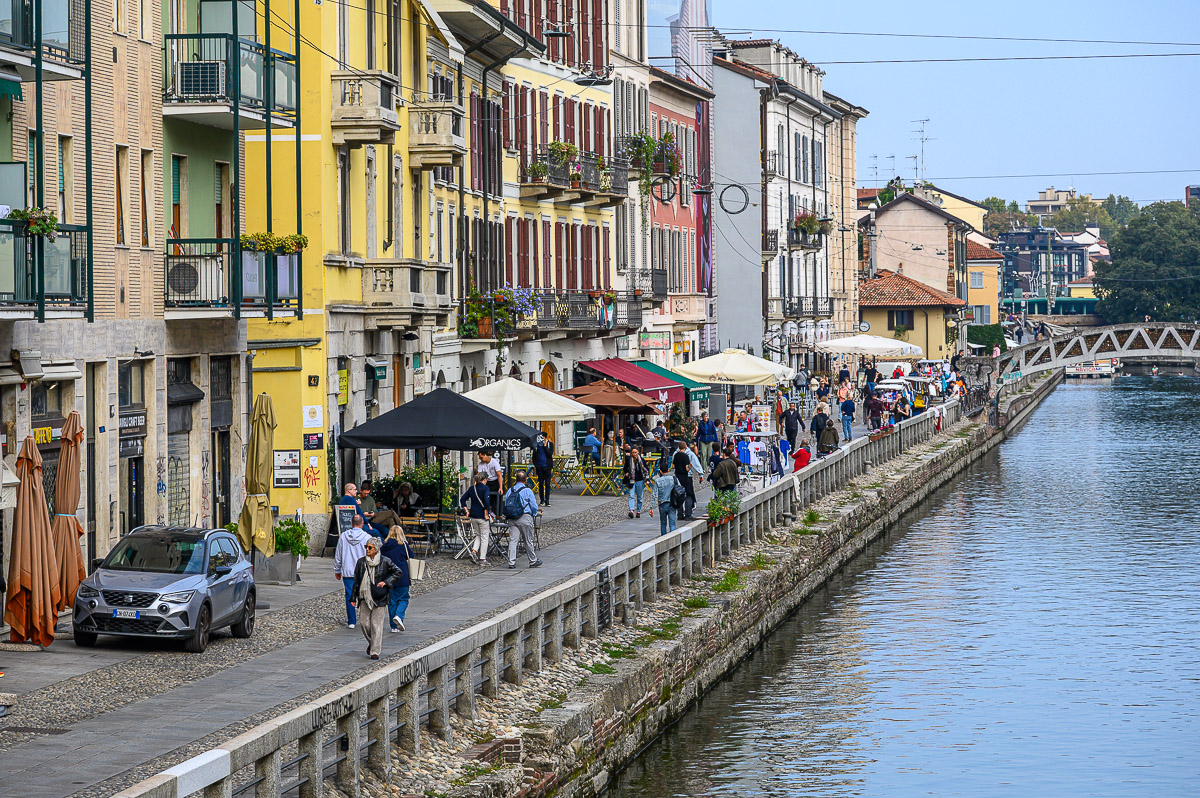 Erhalten geblieben sind einige Teilstücke des Naviglio Grande und des Naviglio Pavese sowie das Hafenbecken der Darsena (Docks). Wir machen einen Rundgang entlang dieser beiden Kanäle und staunen über die vielen Leute (Einheimische und Touristen) sowie über die vielen Restaurants und Bars – von den massenhaften Souvenirständen abgesehen. Aber wenn man aus dem geschäftigen und lärmigen Zentrum kommt, fühlt man sich hier plötzlich in einer ganz anderen Welt.
