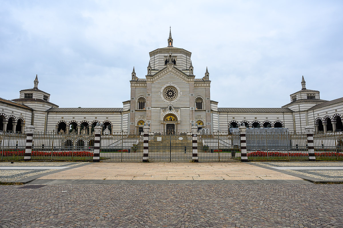 Der Haupteingang befindet sich am Piazzale del Cimitero Monumentale. Als Architekt fungierte Carlo Maciachini. Der Famedio (Ruhmestempel) dient als Grabstätte für einige der berühmtesten Italiener. Von künstlerischem und generellem Interesse sind allerdings auch zahlreiche andere Grabstätten, in denen das Mailänder Grossbürgertum einander an Prunk und Pomp zu übertreffen suchte.