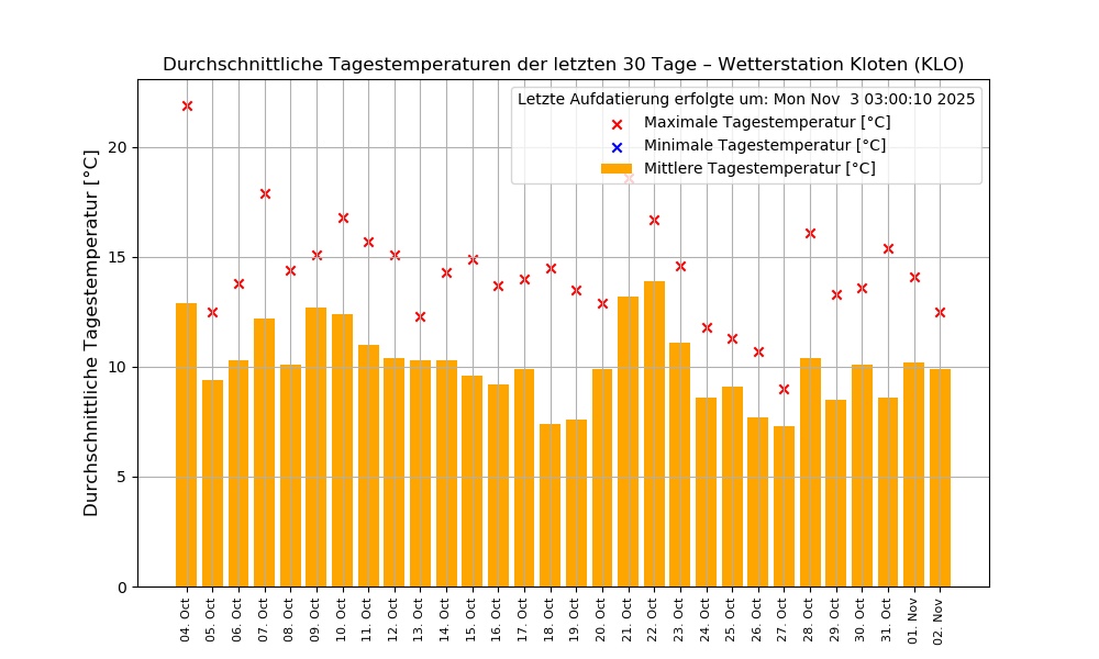 Durchschnittstemperaturen der letzten 30 Tage (Kloten, KLO)